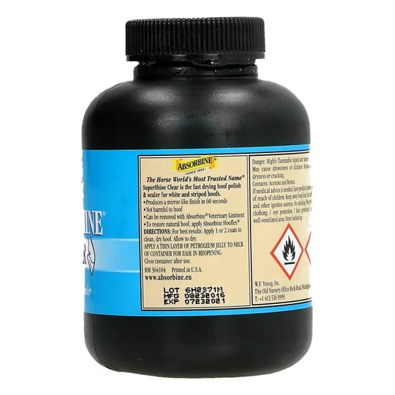 Supershine verleiht dem Huf ein glänzendes Aussehen. Es trocknet sehr schnell und verhindert so, dass sich Staub und Schmutz ablagern können.