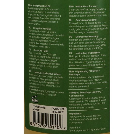 Huföl, einschließlich Hanföl, hilft, den Huf vor Splittern und Splittern zu schützen. Außerdem nährt und pflegt es das Horn und verleiht dem Huf einen schönen Glanz.