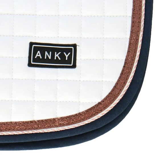 Das Pad hat eine quadratische Abstufung und ist mit einem kupferfarbenen Besatz und einem geflochtenen roségoldenen Kordelbesatz versehen. Praktisches Detail: Das Pad hat Gurtschlaufen mit Klettverschluss.