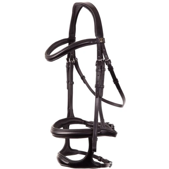 Dieser symmetrische Trensenzaum aus hochwertigem europäischem Leder hat ein E-Line-Genickstück. Dieses anatomisch geformte Genickstück ist weich gepolstert und bietet dank seiner runden Form zusätzliche Ohrenfreiheit. Das geschwungene Stirnband ist weich gepolstert und rund bombiert. Der Kehlriemen ist beidseitig verstellbar. Die Backenstücke sind mit Zaumhaken versehen. Der doppelte Nasenriemen kombiniert die Funktion eines englischen und eines Hannoveranischen Nasenriemens und eignet sich dadurch für starke Pferde. Der Abstand zwischen den beiden Nasenriemen beträgt ungefähr 7 cm. Der englische Nasenriemen (ca. 3 cm breit) ist rund bombiert, weich gepolstert und mit einem weich gepolsterten Kinnschutz versehen. Der Hannoveranische Nasenriemen ist auf der Vorderseite bombiert und teilweise weich gepolstert. Auf der Rückseite sieht dieser Nasenriemen aus wie ein Sperrriemen. Die Schnalle dieses Riemens ist mit einer zusätzlichen Schutzlasche versehen. Die Trense ist mit glänzenden silberfarbenen Beschlägen aus verchromtem Messing ausgerüstet. Ohne Zügel.