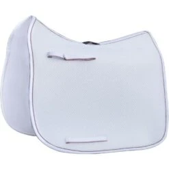 Das 3D-Abstandsmaterial besteht aus Polyesterfasern, die in horizontaler und vertikaler Richtung verwoben sind. Das macht das Material langlebig, belastbar und leicht. Durch die zwei Webrichtungen der Fasern entsteht eine offene Struktur, die sehr belastbar ist. Dadurch bietet es eine gute Druckverteilung und Stoßdämpfung. Ein Vorteil für Reiter und Pferd! Das Material passt sich dem Pferderücken an, springt aber ohne Druck in seinen ursprünglichen Zustand zurück. Dadurch bekommt das Pad keinen Abdruck vom Sattel und die Bewegungen des Pferdes werden gut unterstützt. Die am Pferd anliegende Innenschicht des Pads besteht aus weichen Fasern und ist somit angenehm für das Pferd. Die äußere Schicht ist etwas steifer, damit die Schabracke in Form bleibt und der Reiter gestützt wird.