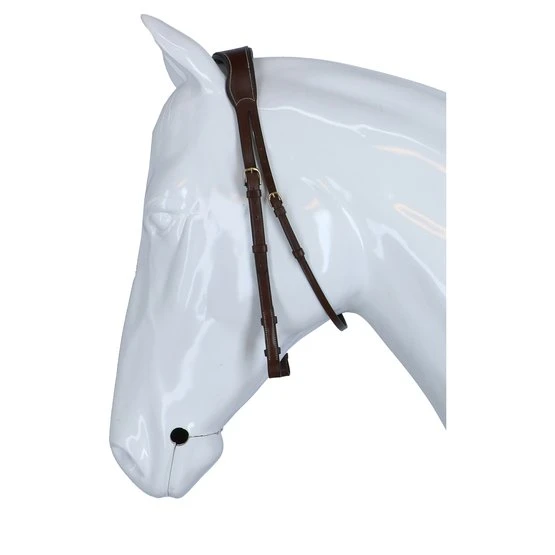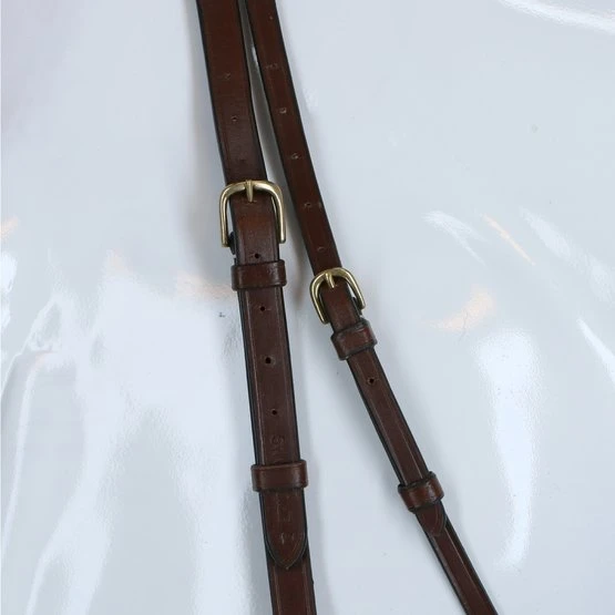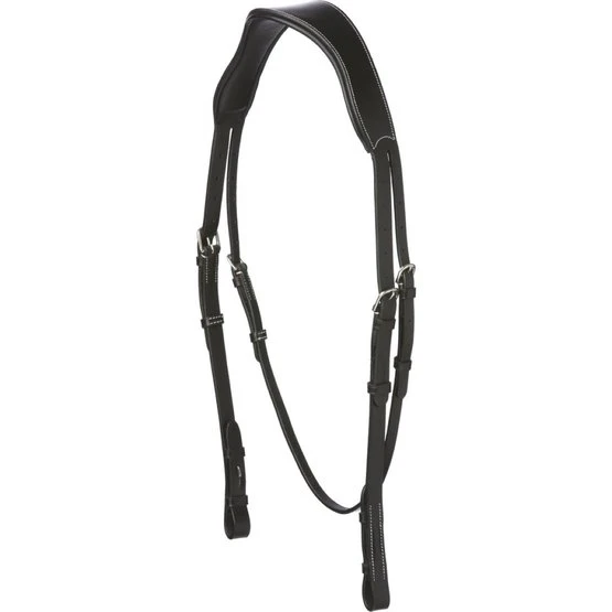 Gefüttert mit glatt gefüllten Färsenleder mit Kontrastnähten an den Rändern. Doppelter Verschluss am Halsgurt. Blindverschluss am Meißelteil der Backstücke.