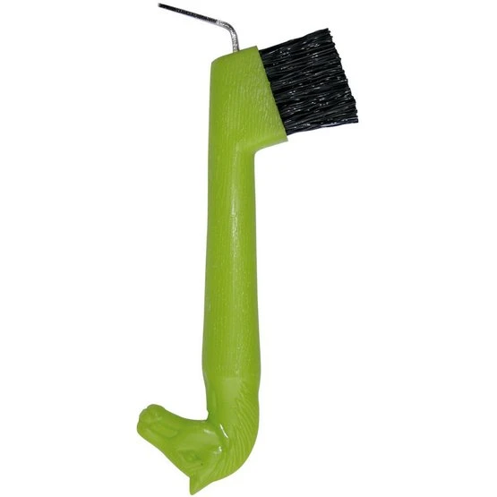 Strapazierfähiger Kunstoffhufkratzer mit Bürste und Pferdekopf.