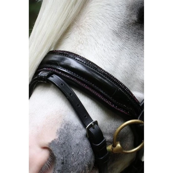 Diese Trense wurde speziell mit einem anatomisch weich gepolsterten und nach hinten geschnittenen Genickstück entwickelt. Dieses Kopfstück ist so geformt, dass es den Druck hinter den Ohren und auf dem Kopf reduziert. Der Nasenriemen ist noch besser anatomisch geformt, dadurch sitzt er noch besser und verringert den Druck auf der Nase. Das Nasenband enthält Glitzer und diese Farben spiegeln sich im Stirnband wider. Das Stirnband ist speziell mit Swarofski-Steinen gefertigt. Kommt mit weichen Lederzügeln.