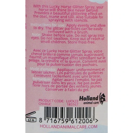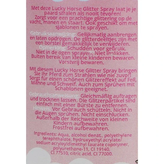 Lasse dein Pferd oder Pony glänzen wie nie zuvor mit diesem Glitzerspray von Lucky Horse. Das Glitzerspray von Lucky Horse sorgt für einen schönen Glitzereffekt auf Fell, Mähne und Schweif. Das Glitzerspray kann mit einem Pinsel leicht entfernt werden.