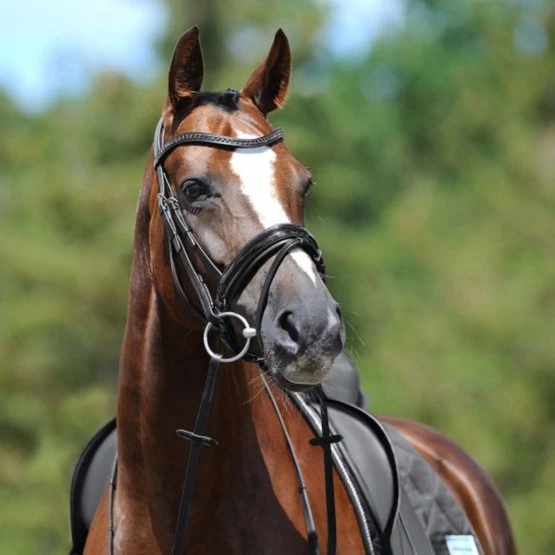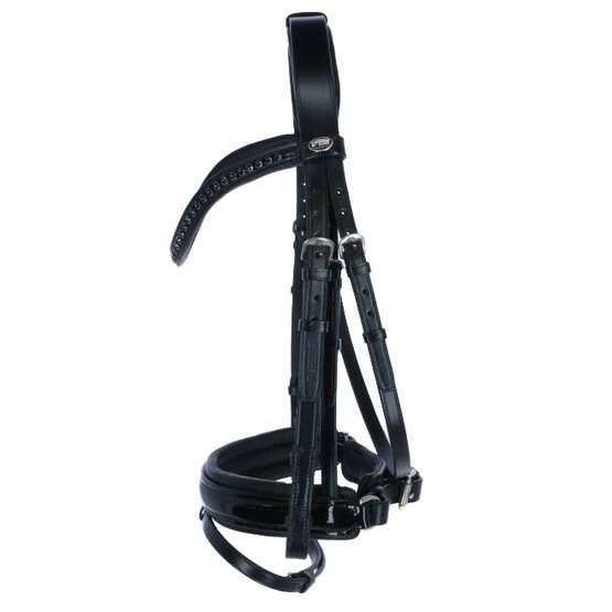 Die Lacktrense Apollo mit ihrem eleganten, geschwungenen Stirnriemen mit funkelnden Swarovski Elements sorgt für glänzende Auftritte. Bei der schwarzen Trense strahlen die Swarovski Elements in geheimnisvoll dunklem Graphite, bei der Trense in Havanna ist der Stirnriemen mit brillant funkelnden Clear Crystals besetzt. Die Trense überzeugt mit ihrem weich unterfütterten Reithalfter Spezial mit glänzendem Lackleder und Sperrriemen. Die Kopfstrippe ist ebenfalls weich unterfüttert, und das Reithalfterkopfstück ist fest mit dem Trensenkopfstück verbunden, so dass der Druck auf das Genick des Pferdes nachhaltig gemindert wird. Ein absoluter Traum von einer Trense! Diese Trense wird inkl. Zügeln geliefert.